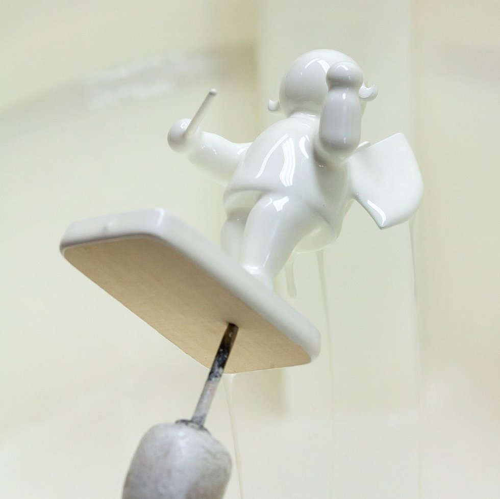 Bei diesem Arbeitsschritt werden Figuren, von unten auf Nadeln gesteckt, kopfüber in ein Farbbad getaucht und schnell gedreht. Dadurch wird die überschüssige Farbe abgeschleudert. Dieser Prozess wird dreimal wiederholt, bevor die Figuren im Anschluss mindestens zehn Tage trocknen. Die ersten beiden Tauchgänge bilden die Grundierung für die Figuren. Abschließend erfolgt das Tauchen mit Lack vor der späteren Bemalung.