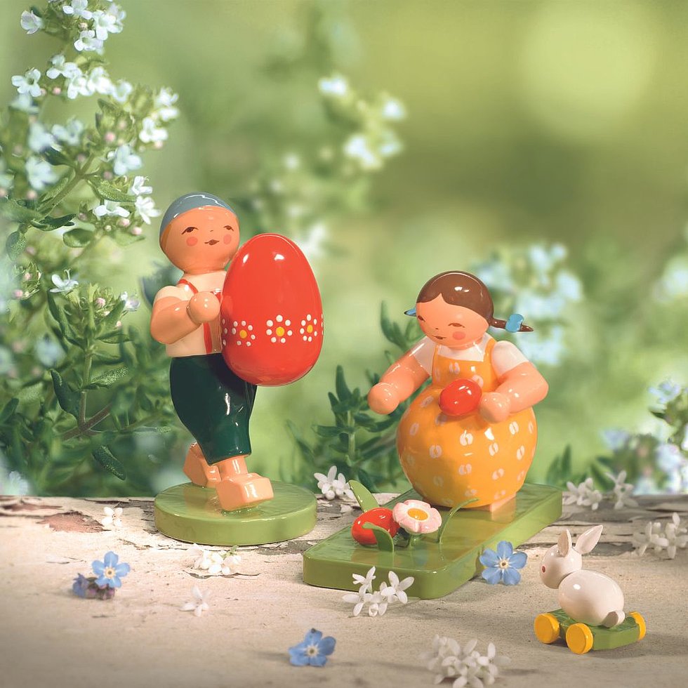 Nachdem die Osterkinder nach ihren Körbchen gesucht haben, finden sie zusammen, um sich die Ostereier zu präsentieren und zu spielen. Was für ein Spaß! So fühlen sich die Osterkinder am wohlsten: in geselliger Runde mit anderen Figuren zwischen farbenfrohen Frühblühern und frischem Grün. Eine idyllische Szene, die sich mit Miniatur-Vasen und zarten Blumen einfach auf einem Regal oder als Tischdekoration nachstellen lässt.