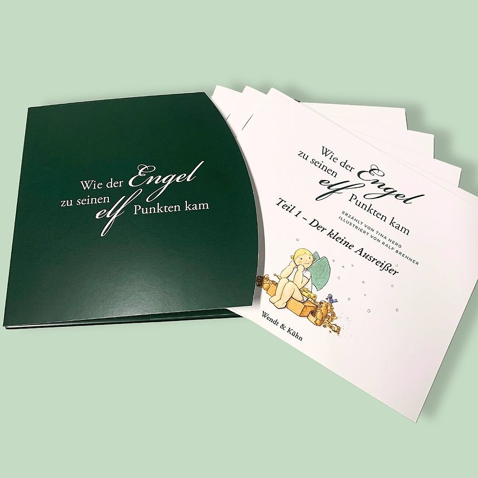 5 Mini-Bücher, verstaut in einer grünen Mappe, erzählen die Geschichte "Wie der Engel zu seinen elf Punkten kam" und lassen Leser jeden Alters in die Welt des kleinen Schalmeispielers eintauchen. Bevor er im großen Orchester mitspielen darf, muss er einige Prüfungen bestehen. Das Set ist eine schöne Erinnerung an einen Kindergeburtstag, einen Ausflug mit der Familie oder an einen Wandertag mit der Schulklasse.