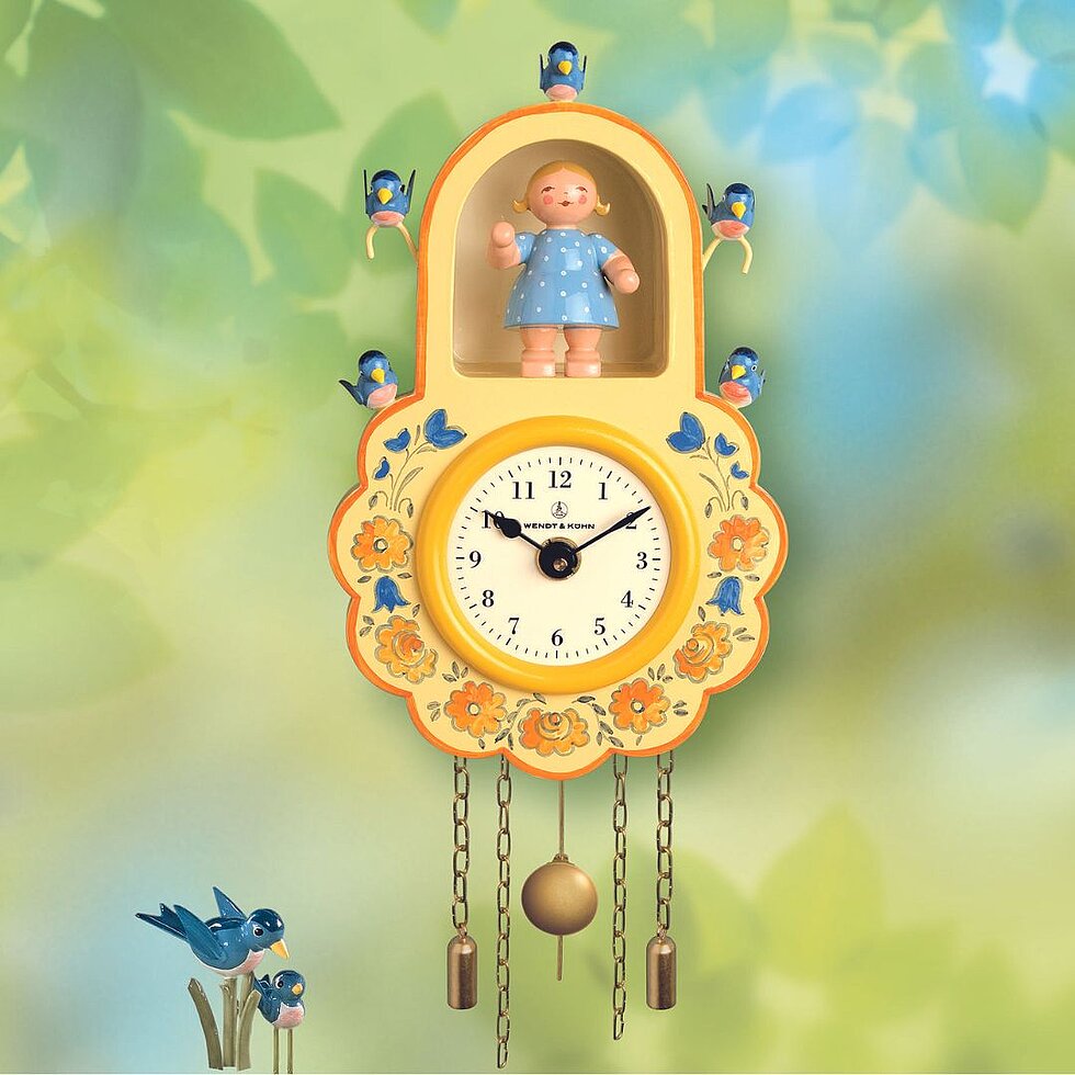 Die Wanduhren von Wendt & Kühn begeistern mit zeitloser Schönheit. In der Szene der gelben Wanduhr begrüßt ein blondes Mädchen, umgeben von fünf Vögeln, freudig den Tag. Unter nächtlichem Sternenhimmel hingegen schwebt der Margeritenengel im Bogen der blauen Wanduhr zur Erde. Er hält seine schützende Hand über das Dorf und auch über das schlafende Kind. Welch schöne Symbolik in diesen Uhren, die hoffentlich ein Leben lang verzaubern.