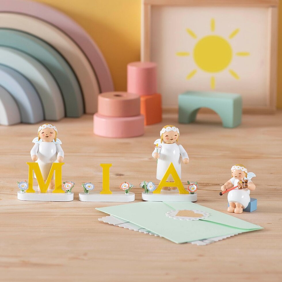 Ganz individuell lassen sich mit den Margeritenengeln in weißen Kleidern und den sonnengelben Buchstaben zur Geburt oder Taufe persönliche Botschaften oder der Namenszug des Neugeborenen gestalten. Sanft lächelnd stehen die Margeritenengel bereit, um zu überraschen und zu erfreuen. Sowohl die Himmelsboten als auch die Buchstaben stehen auf speziell gefertigten Sockeln und lassen sich so besonders gut zusammenfügen. Kleine Blüten darauf begleiten die Szene.