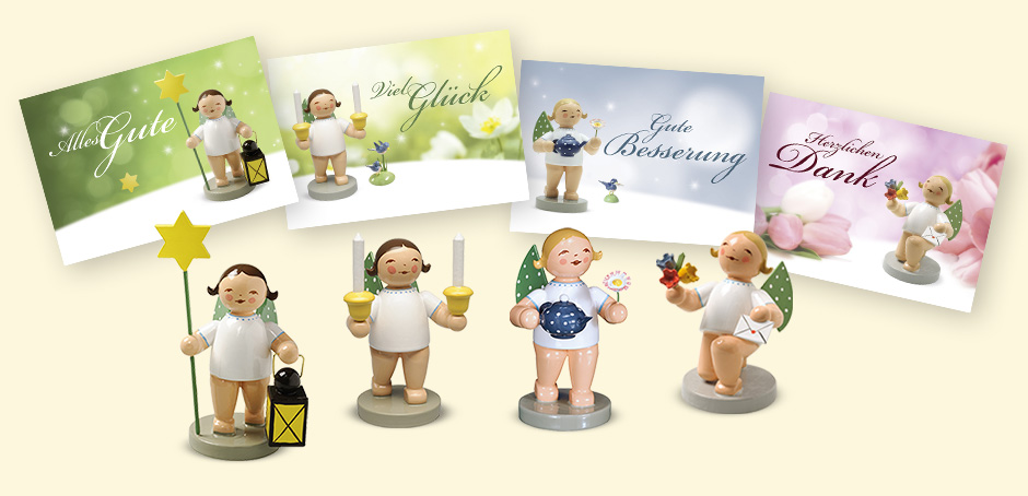 Was könnte dafür besser passen, als diesen Engeln des Alltags einen Grünhainichener Engel® mit einer liebevollen Botschaft zu überreichen? Sie können aus vier kunstvoll gestalteten Klappkarten mit dazu gehöriger Figur wählen. Jedes Set bildet ein besonderes und individuelles Geschenk – eben ein Engel für einen Engel. Suchen Sie Ihren Wunschengel aus und teilen Sie uns Ihre persönlichen Grüße mit. Anschließend übernehmen wir den Versand an die von Ihnen angegebene Adresse.