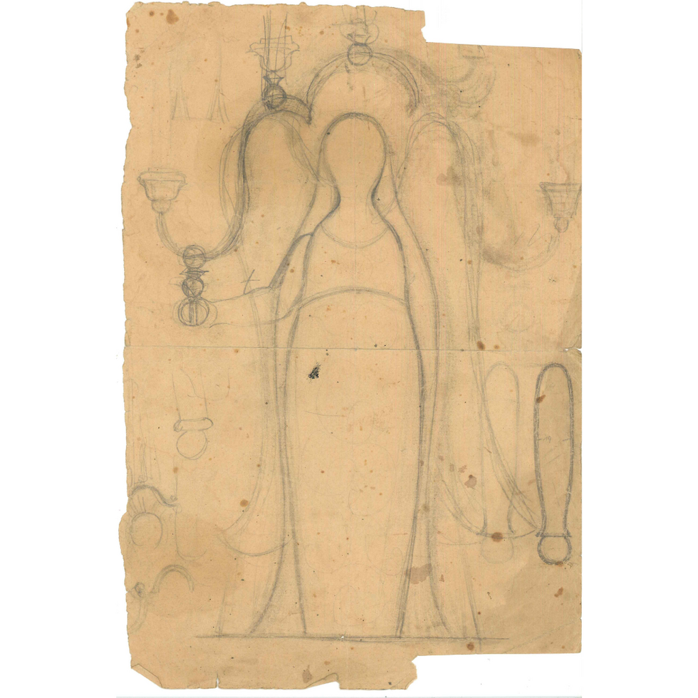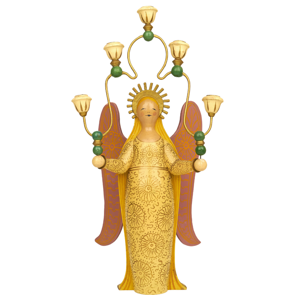 Dieser Engel beeindruckt nicht nur durch seine Größe: Kleid, Schleier und Flügel schmückt eine meisterhafte Bemalung. Florale Elemente, feine Wellenlinien und zarte Punkte lassen ein wahres Kunstwerk entstehen. Erfahrung und Geschick sind dafür unabdingbar. Der Lichterträger entstand bereits in den Anfangsjahren der Manufaktur (vor/gleich 1920). Während Grete Wendt die Form entwarf, entwickelte Olly Sommer (später Wendt) seine eindrucksvolle Bemalung. Seine Augen blicken gütig – in einer weiteren Variante (auf Wunsch ebenfalls erhältlich) sind sie andächtig geschlossen.